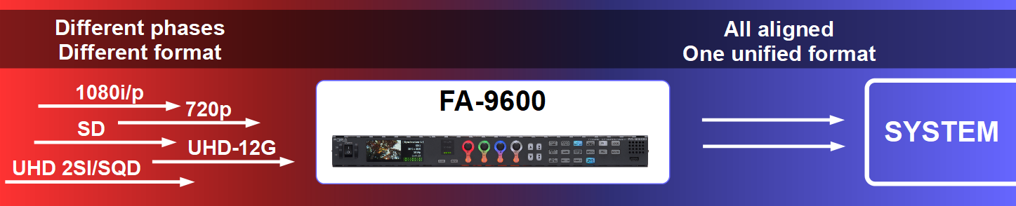 - Converts between SD/720p/1080i, interlaced/progressive and 3G-SDI Level-A/B. When used with FA-964K, converts resolutions from SD up to 4K*1.
