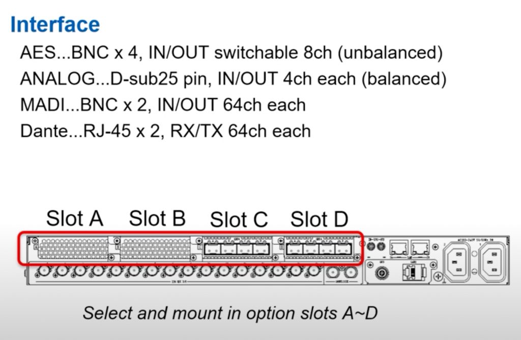 The FA-1616’s audio options are selectable and mountable in slots A to D, offering AES, analog audio, MADI, and Dante interfaces. The audio interface is optional, but the mapping function is a standard feature. This flexibility allows for comprehensive audio channel mapping, addressing various audio processing needs.