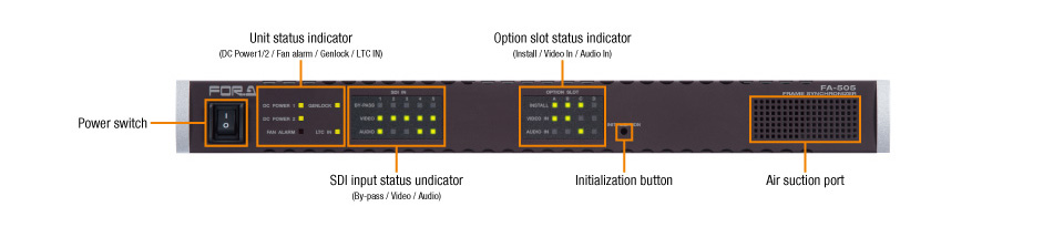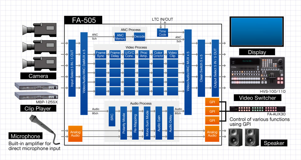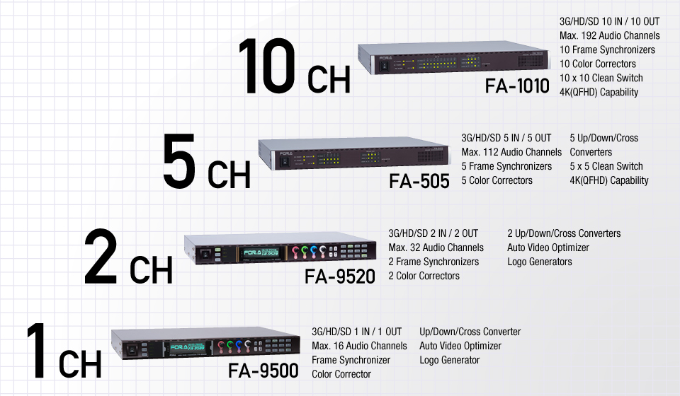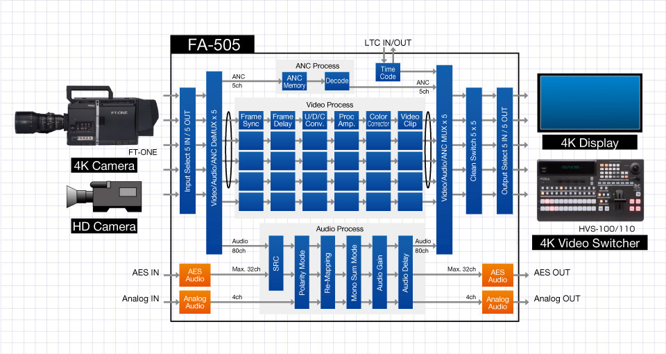 A sister model of the 10-input/10-output FA-1010, which has 10-channel processing, the FA-505, with 5 inputs, 5 outputs and 5-channel processing, also comes equipped with features not found in the FA-1010, including an up/down/cross/aspect converter function. Like the FA-1010, the FA-505 is not simply 5 processors enclosed in a single housing, but 5 interconnected internal circuits. It implements all the various processors and clean switch functions required to build a system, and enables multi-channel signal processing on each channel with no cable connections. In addition, as ancillary and audio signal data are handled separately from video signals, concerns about ancillary data such as subtitles and time codes being erased can be allayed.