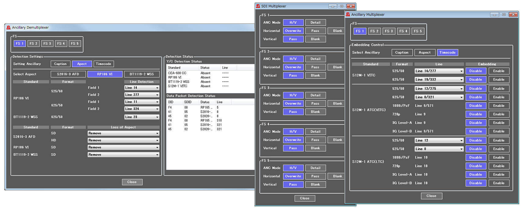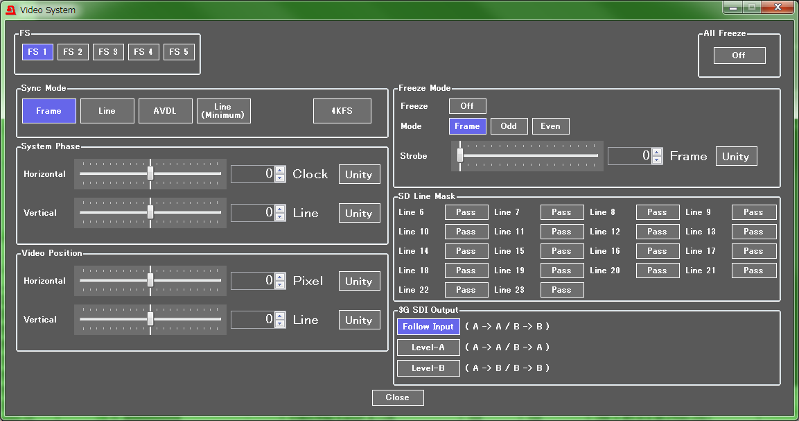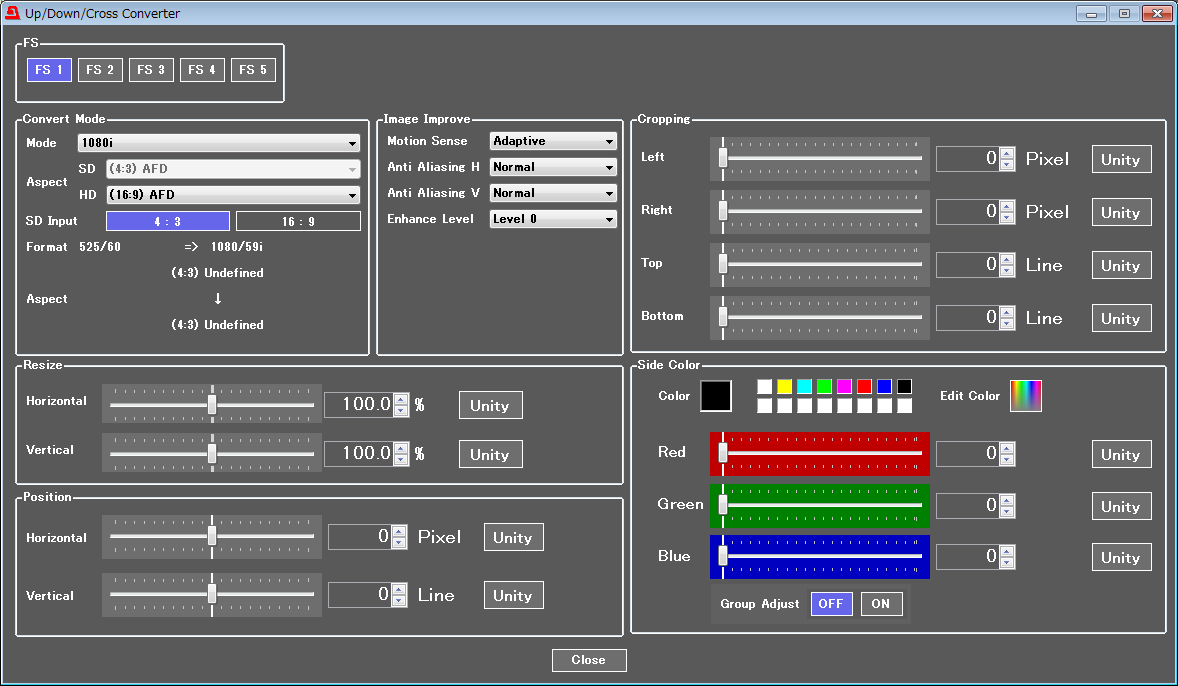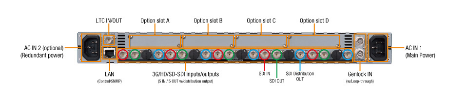 The FA-505 comes equipped with an up/down/cross/aspect converter function on each input. 3G, HD, and SD signals can be mutually inter-converted.