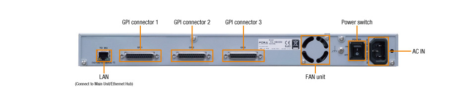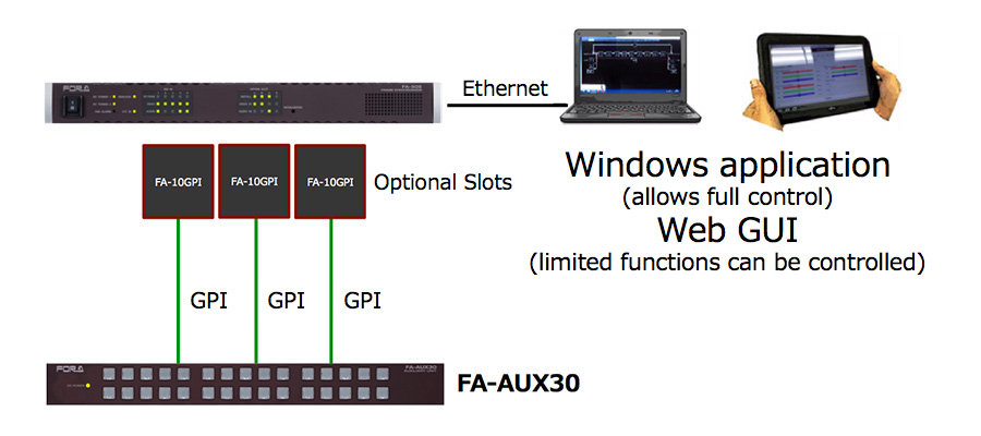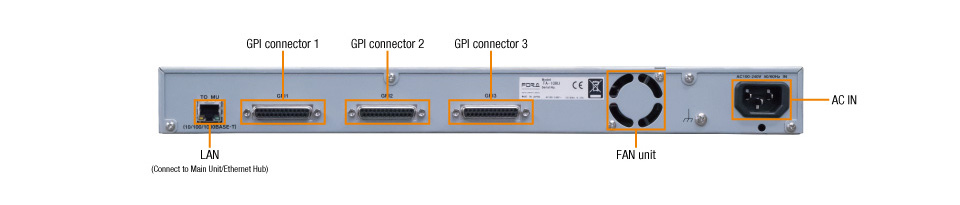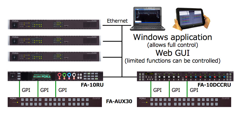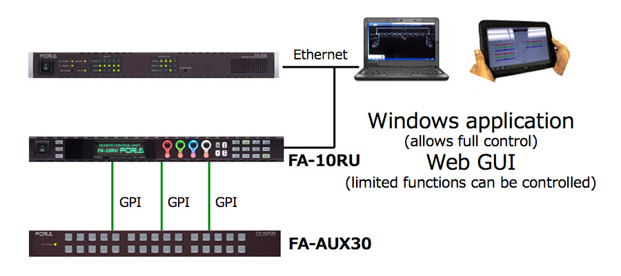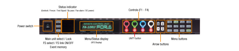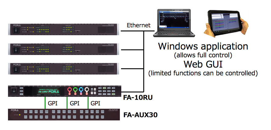 The FA-10RU remote control unit provides dedicated access to the full features of the FA-505 and can control up to 100 FA-505s. One FA-505 is also able to be controlled from multiple remote control units or GUIs at the same time (with up to five concurrent connections possible).