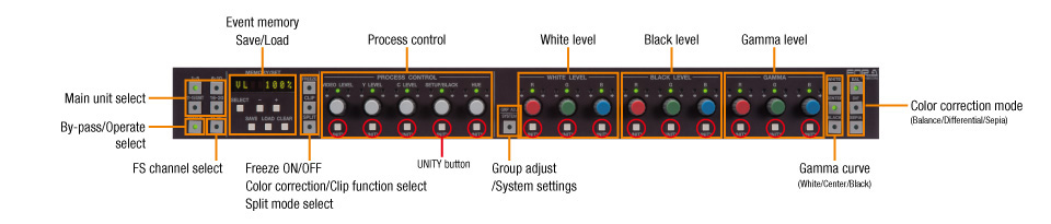The FA-10DCCRU remote control unit for color correction has inherited the traditional operating style of FOR-A's color corrector series of products and offers direct access to a variety of parameters for smooth color adjustment.
