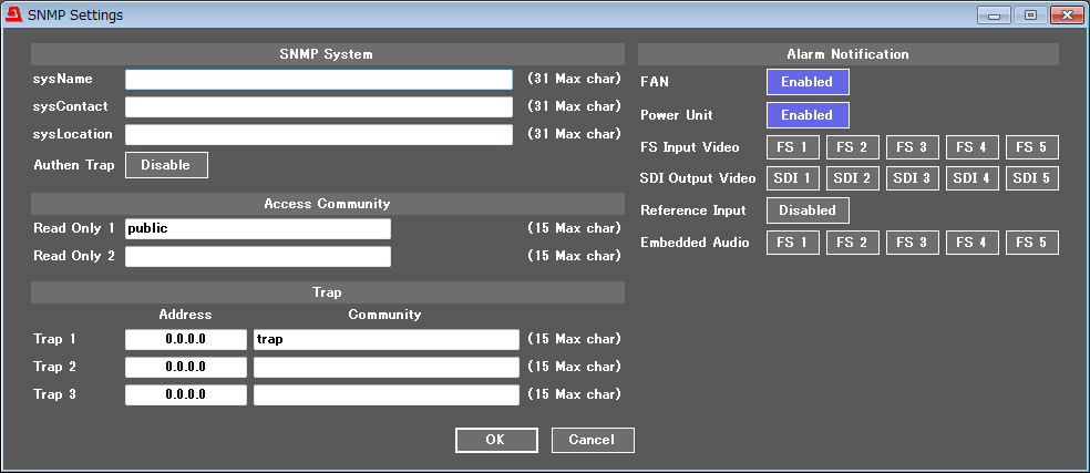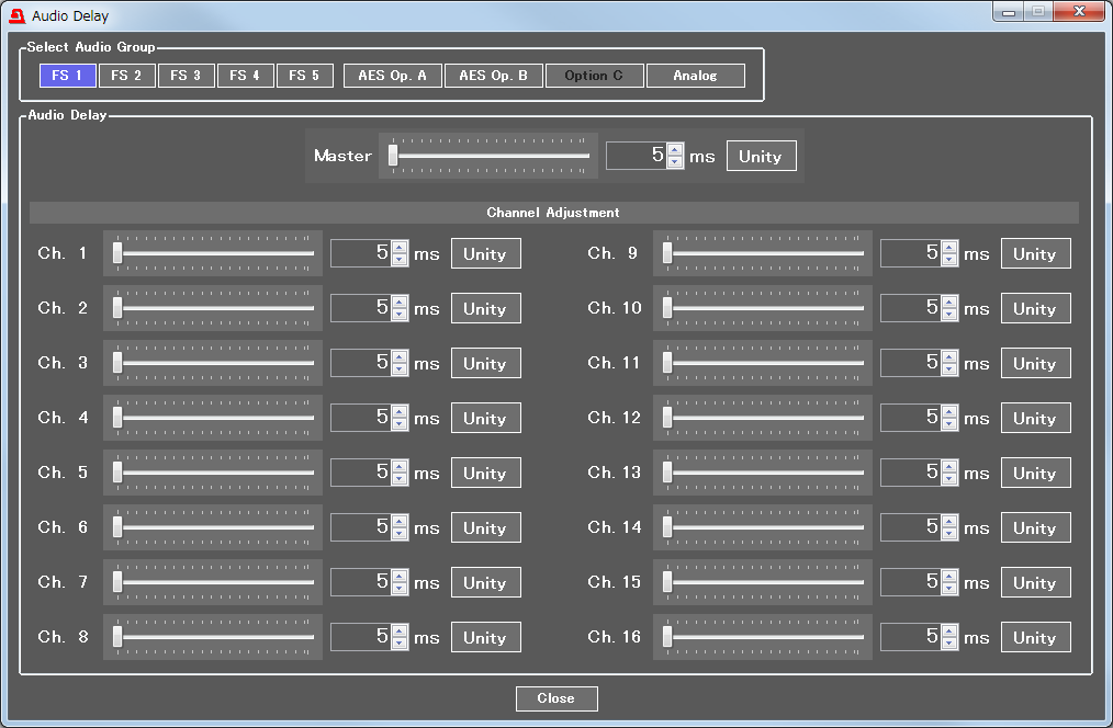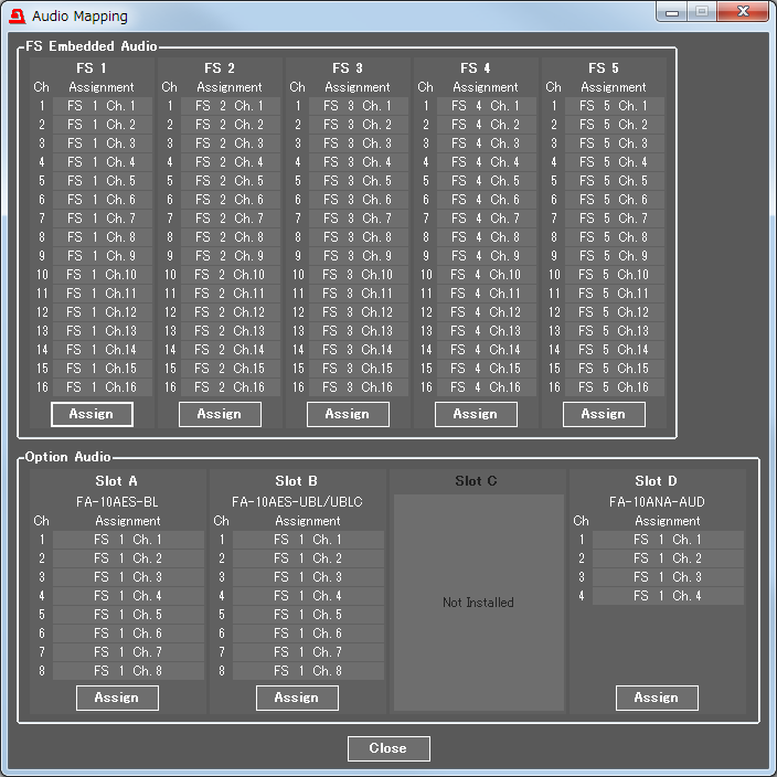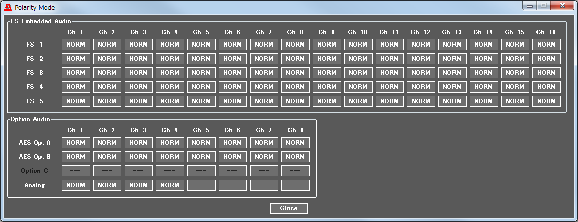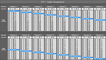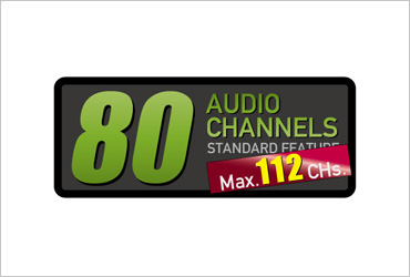 You can remap which audio signal channels to assign to each video or each audio channel. Up to 80 channels of audio signal can be freely re-mapped as standard, or up to 112 channels when optional cards are installed. Delay adjustment and polarity conversion are also available on each channel, allowing systems to be configured without any special audio processing equipment.