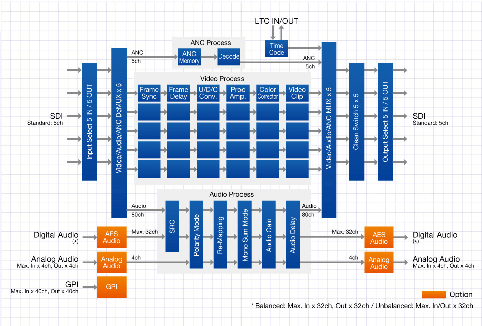 With 16 channels of 3G/HD (synchronous/asynchronous) and SD-SDI*1 (synchronous) embedded audio on each input supporting up to 80 channels on all 5 inputs, a versatile array of signal processing is possible, including standard SDI embedding and de-embedding, and if an optional expansion card is installed, A/D and D/A conversion. The analog audio input option is equipped with a microphone head amplifier and phantom power, enabling direct condenser microphone input with no need for impedance conversion. The unit also includes sampling rate converters as well as various other processes such as level adjustment, delay adjustment, down-mixing*2, remapping, and polarity conversion.