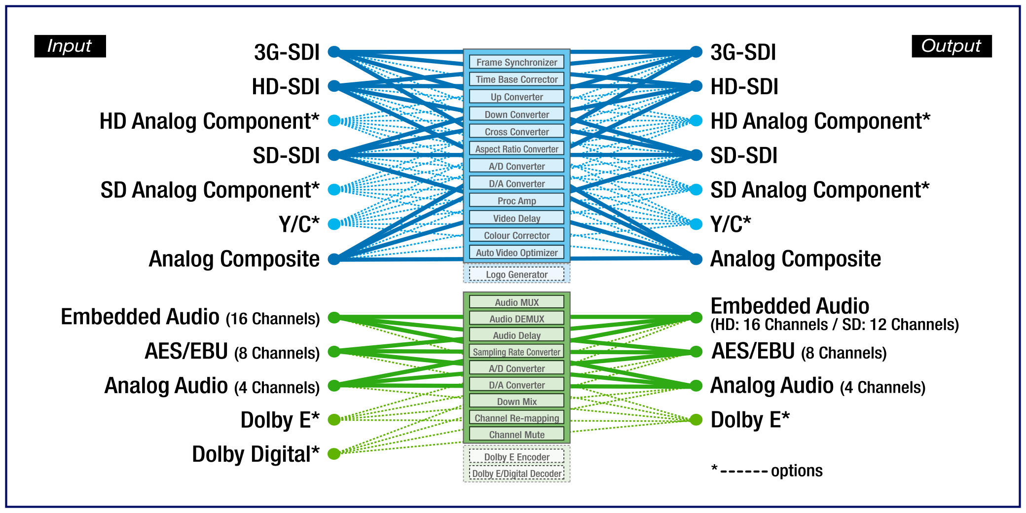 The FA-9500 is a multipurpose signal processor loaded with the functions you need for video production. The unit supports 3G-SDI, HD/SD-SDI, and analog composite I/O. In addition to its functionality as a frame synchronizer, it also provides up/down/cross/aspect converter, color corrector, and automatic video optimizer (AVO) as standard features. It can convert many types of video and audio signals. Numerous additional functions include, as options, analog component I/O, logo generator, Dolby E encoder/decoder. By combining these varied options, a single unit can provide optimal functionality for all video production scenes, including that for transmission, line production, news reporting, production, editing and distribution. As long as you have an FA-9500, you won't need any other piece of peripheral video equipment.