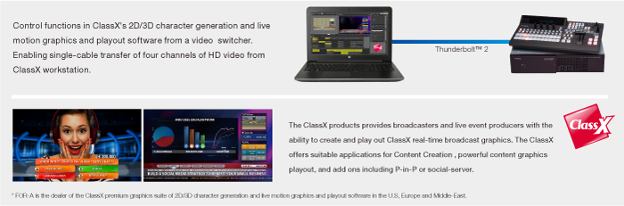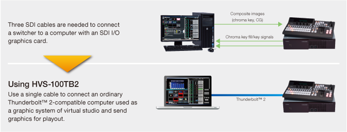 Thunderbolt™ 2 I/O expansion card for HVS-100/HVS-490/HVS-2000 switchers,enabling single-cable transfer of four channels of HD video from a computer.