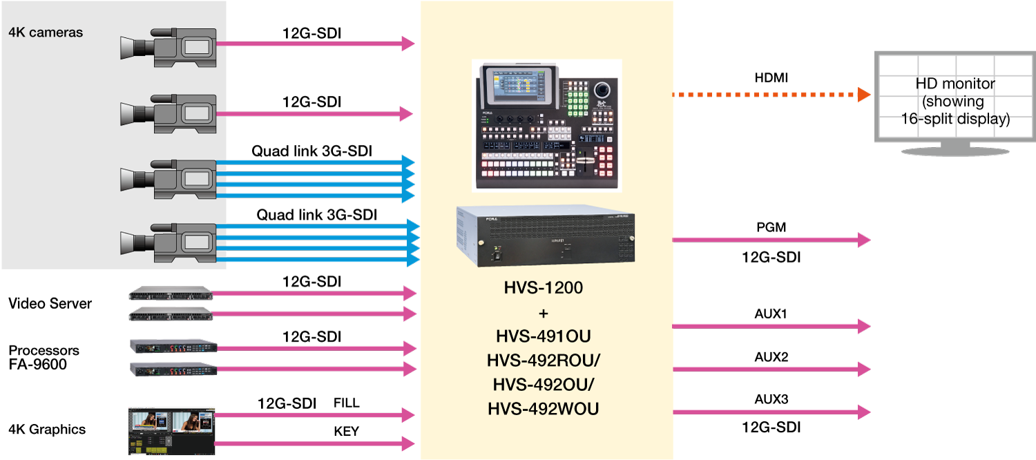 In 4K(UHD) mode, the switcher features 10 inputs and 10 outputs, including two outputs for HDMI 2.0 Level B. Supports mixed input/output of 12G-SDI and Quad Link 3G-SDI for 2160/59.94p,50p. Supports mixed input/output of 6G-SDI and 3G-SDI x 2 for 2160/29.97p,25p,23.98p.