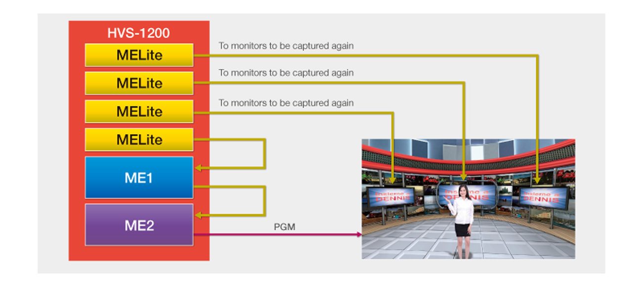 - Any M/E can be assigned to multiple on-stage monitors for independent background transitions and graphics transitions – all from the same control panel.