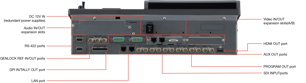 External interfaces include GPI port supporting up to 24 inputs/outputs and two RS-422 ports as standard. An Ethernet port is used during PC control.
