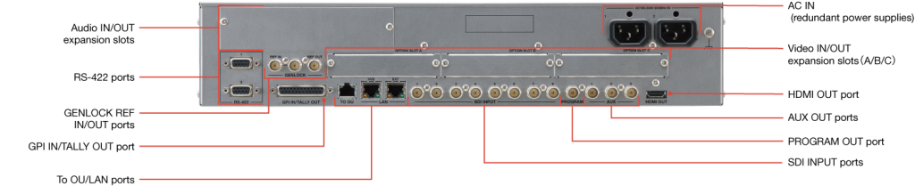 Frame sync and proc amp functionality is provided for all inputs, with safety markers for each output. The HDMI port supports audio output, and, as a 2.0b port, HD or 4K output, with the latter enabling display of HD images in 4 quadrants. Expand input or output for either model with a variety of optional I/O cards.
