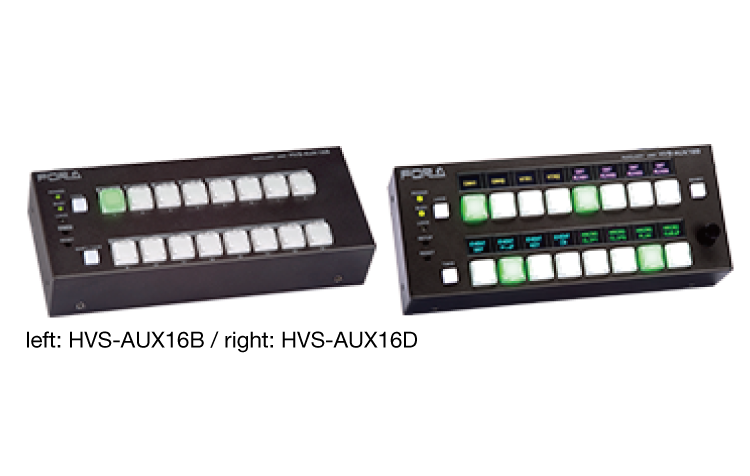 AUX bus control boxes with either 16, 32 or 64 buttons. The16-button control boxes and the 32-button control box are 1RU in size and the 64-button control box is 2RU in size. 9 AUX bus control boxes can be daisy-chained via Ethernet.
