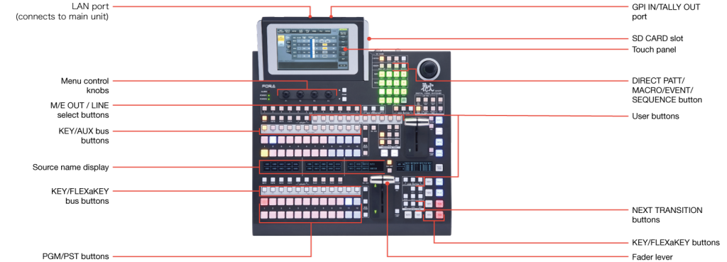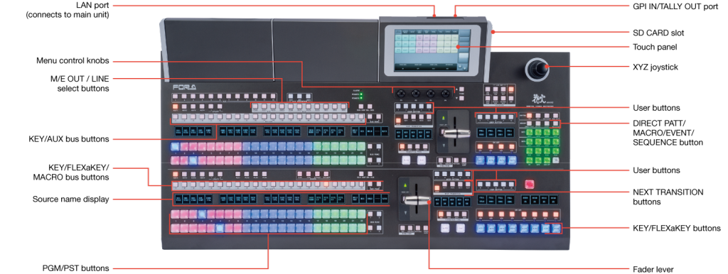 assigned to specific video material or button functions, an OLED display for material, a 7-inch touch panel, source and macro name display, and more. Direct input via a three-axis (XYZ) joystick, menu control knobs, and a keypad. A range of functions can also be assigned to user buttons in convenient locations on the control panel. Use an SD card to load or save configuration files and stills.