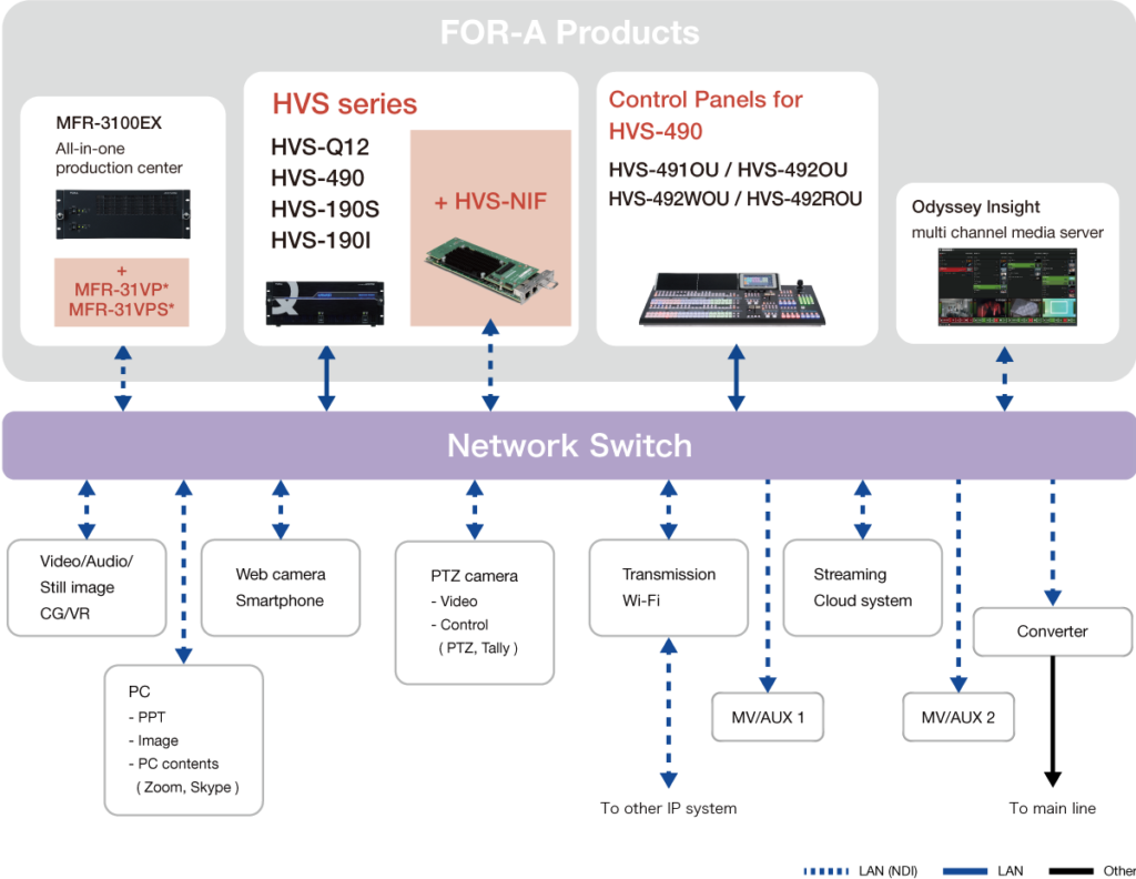 The number of inputs/outputs can be expanded to 60 inputs and 32outputs*1 for HD and 42 inputs and 23 outputs*1 for 4K*2*3. The HVS-Q12 has a compact 4RU size body and up to 8 keyers available on each ME in 3G/HD-SDI. It features FOR-A functions such as HDR/SDR conversion*2*3, up/down conversion*2*3, and audio pass through – even in Frame Synch mode. As for IP I/F, not only NDI®*2, but even Dante®*2 I/F is available on the switcher, simplifying workflows. From 3G-SDI to 12G-SDI*2*3, it can be flexibly configured for any application and requirement.