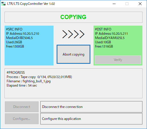 Installed on a computer connected via Ethernet to 2 LTS units, enables LTO tape files to be copied from either unit.