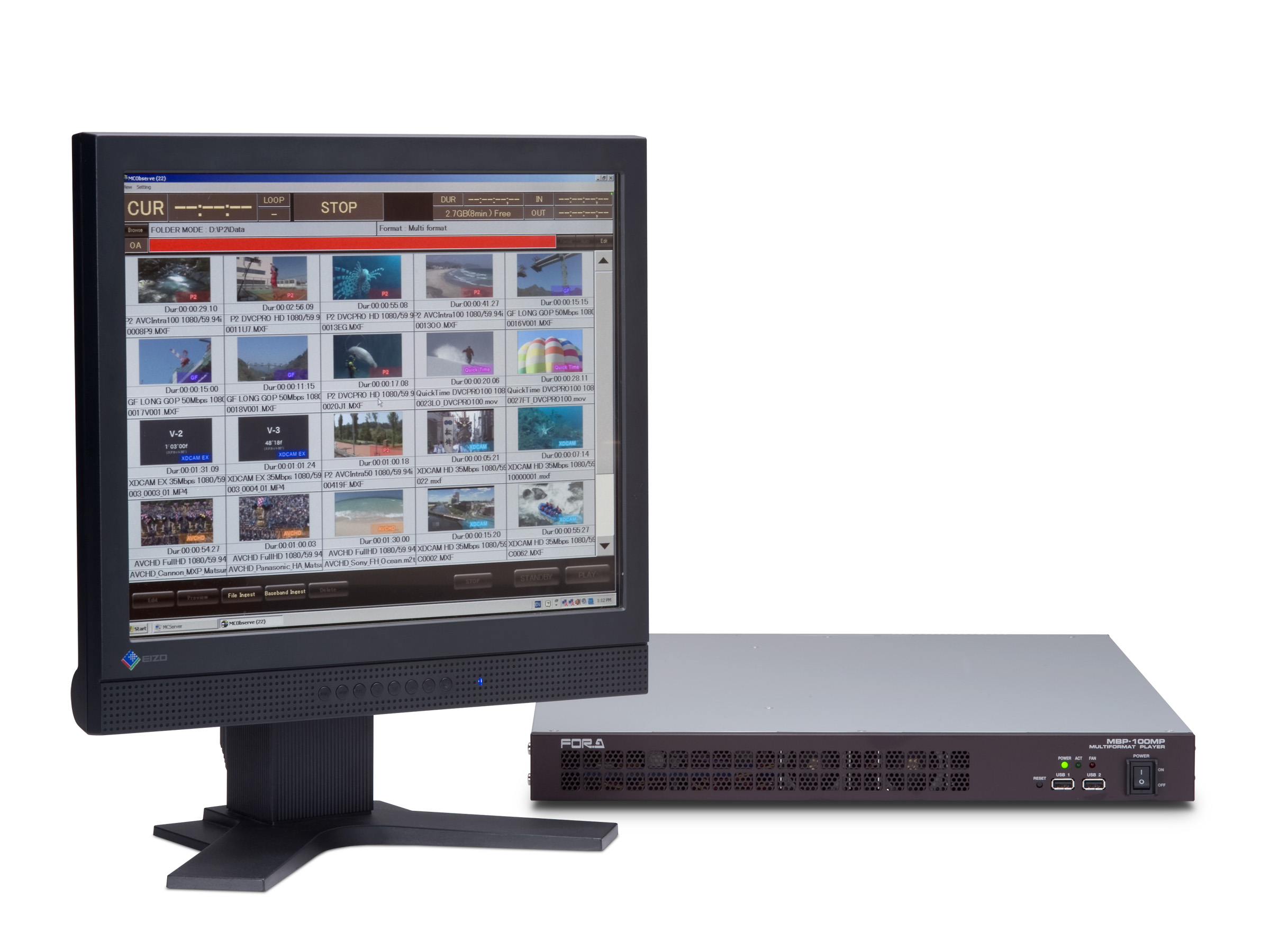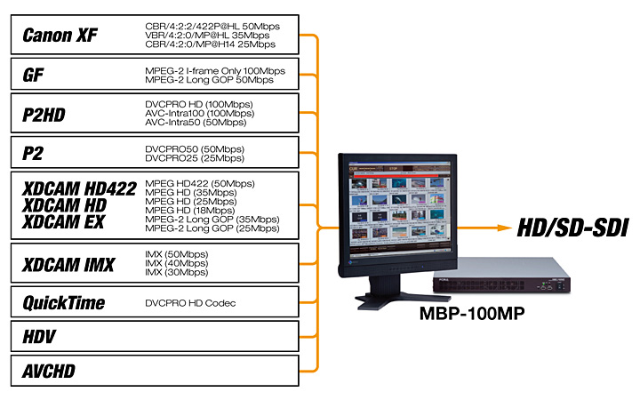 The MBP-100MP is a 1RU size multi-format player offering HD-SDI output of miscellaneous files. The major file formats used in video production, including various MXF files like XDCAM HD and P2HD are supported. The unit is very useful for building a file-based system allowing for the effective use of existing baseband system assets.