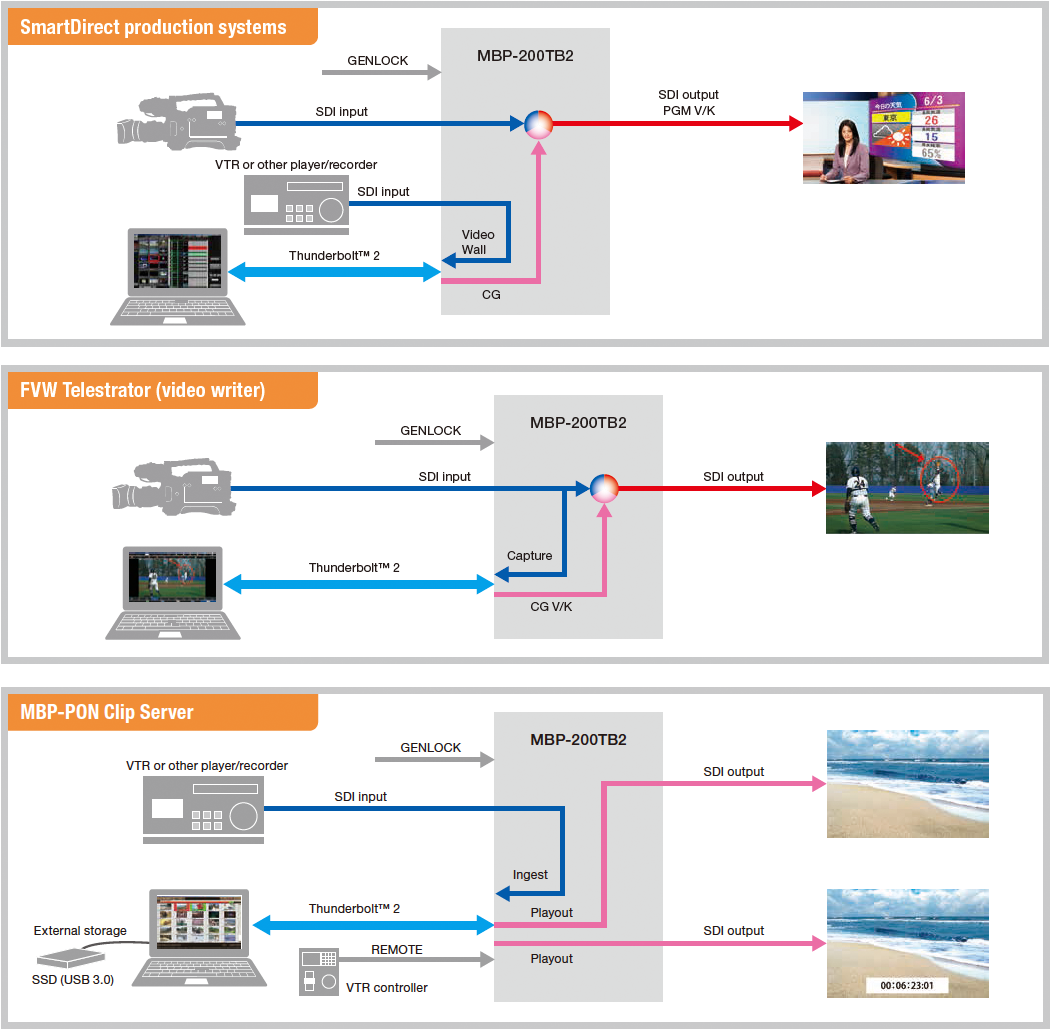 Single-cable transfer for a wide range of graphics applications: On-Air graphics, video marking, clip server playout and more. No need for a workstation or dedicated graphics station – just connect a notebook, camera, or other piece of video equipment.