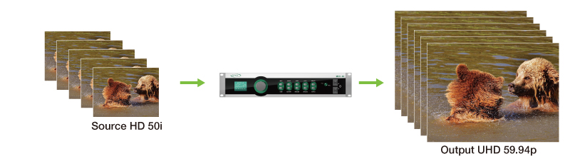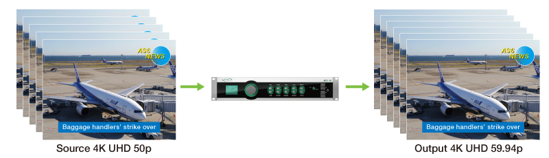 Motion compensated conversion from any 3G/HD-SDI frame rate to any other 3G/HD-SDI frame rate, as well as up-conversion from 3G/HD to UHD and down-conversion UHD to 3G/HD.