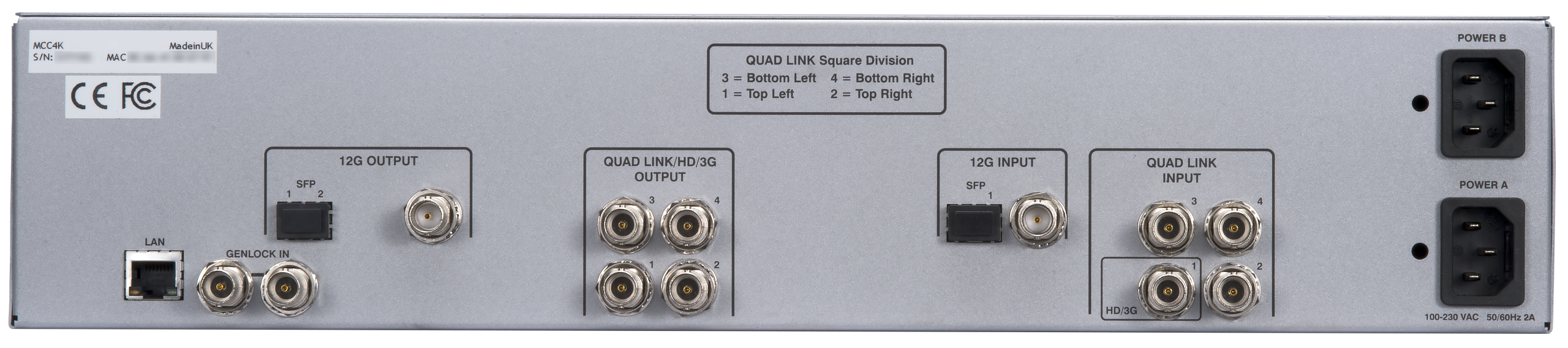 The MCC-4K is a universal standards converter providing exceptional quality frame rate and format conversion for UHD/3G/HD signals. MCC-4K offers support for quad link 3G-SDI of two-Sample Interleaved (2SI) or Square Division (SQD) format as well as single link 12G/6G-SDI and SFP connectivity.