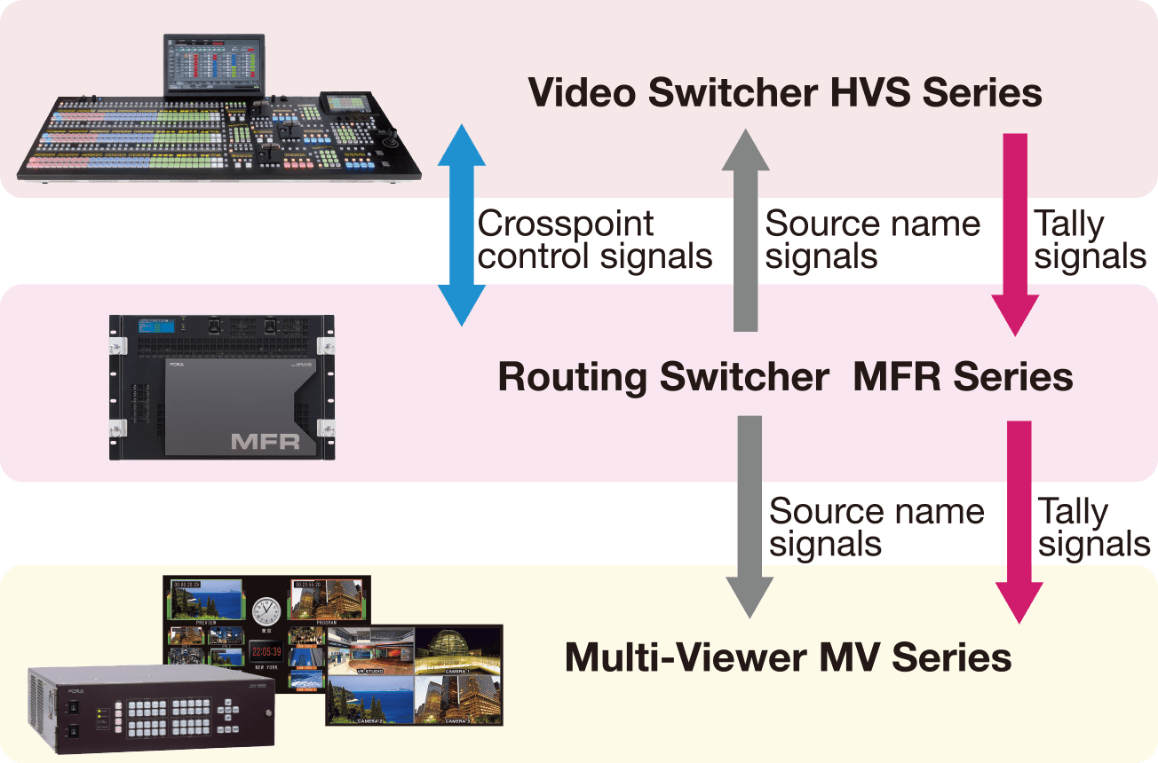 - HVS switcher tally signals are automatically sent to MFR routing switchers and MV multi-viewers for coordinated display.