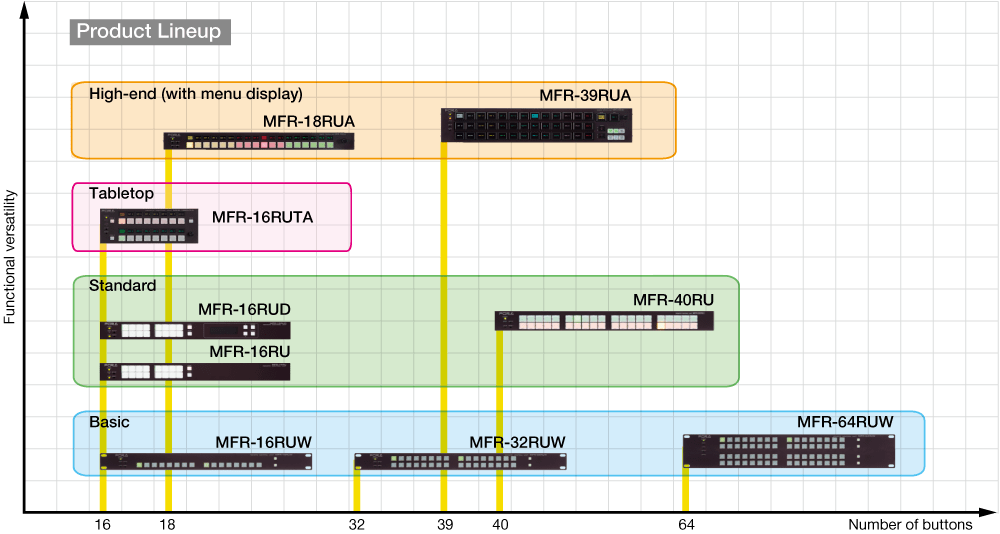We offer several types or remote control unit to suit your application. The number of units that can be connected is a maximum of 127. This lets you build a flexible control environment by the way you partition the matrix and make operation level settings. Please refer to MFR-RU series page for the lineup and details.