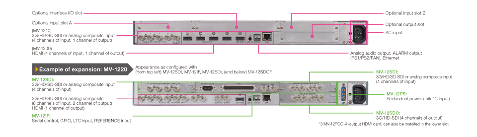*2 Combine up to 2 optional input cards; MV-12SDI (3G/HD/SD-SDI, Composite x 4); MV-12PCI (DVI/HDMI x 4); or the MV-12IF interface card (GPIO, serial control; LTC input, genlock input), as needed.