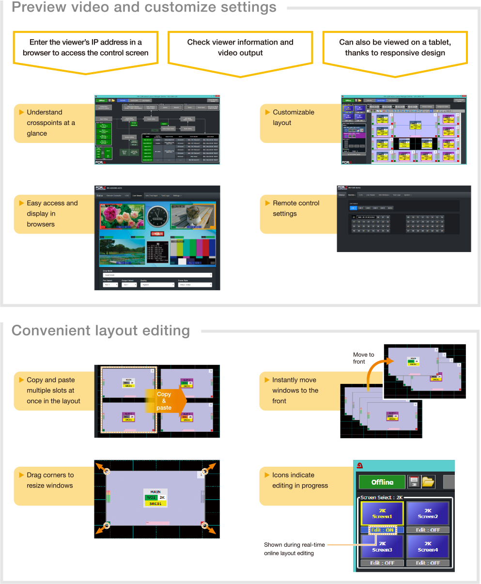Customize layouts, using the software in Windows to adjust image size, position, title display, and other settings. Up to 16 preset patterns each for 4K/2K modes can be stored. Recall saved layouts directly from the front panel control.