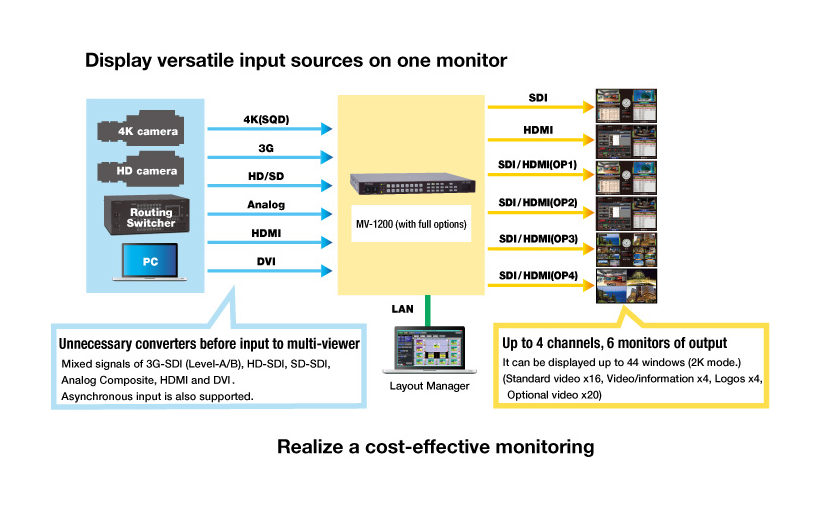 MV-1210*1: SDI 4 inputs/1 output (standard). Up to 16 inputs/6-monitor outputs (SDI/HDMI mixed, optional*2)