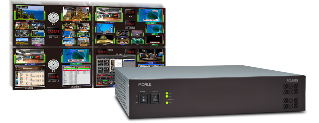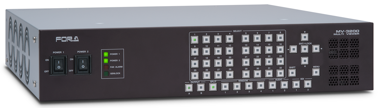 The MV-3200 series is a multi viewer offering a multi-monitor display environment suited to your system by selecting and installing the required input and output cards on a 2U frame. Up to 4 input and 2 output cards can be installed on the frame, for a multi viewer with a maximum of 32 inputs and 4 outputs. Supports mixed input of HD-SDI, SD-SDI, analog composite and DVI (analog and digital) signals.