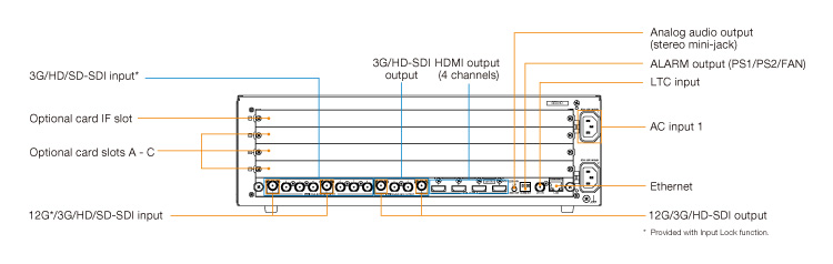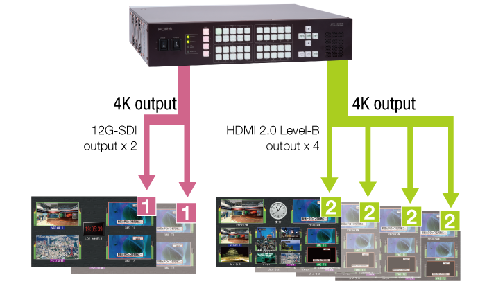 Displays up to 114 windows. Includes 4 outputs each for 3G-SDI and HDMI. Add up to 10 inputs for 12G-SDI.*1
