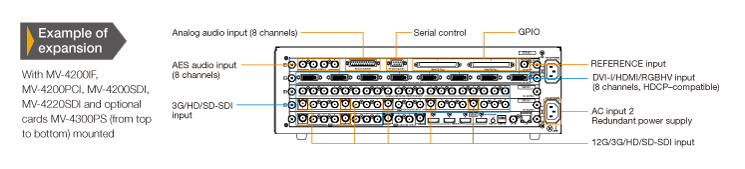 Combine optional input cards, MV-4200SDI (3G/HD/SD-SDI, Composite x 20), MV-4200PCI (DVI-I/HDMI/RGBHV x 8), MV-4220SDI (SDI x 20 inputs installed. Per group of four terminals, select either 12G/6G-SDI × 1 or 3G/HD/SD-SDI × 4), or the optional MV-4200IF interface card (GPIO, serial control, input of analog audio, AES audio, genlock), as needed.