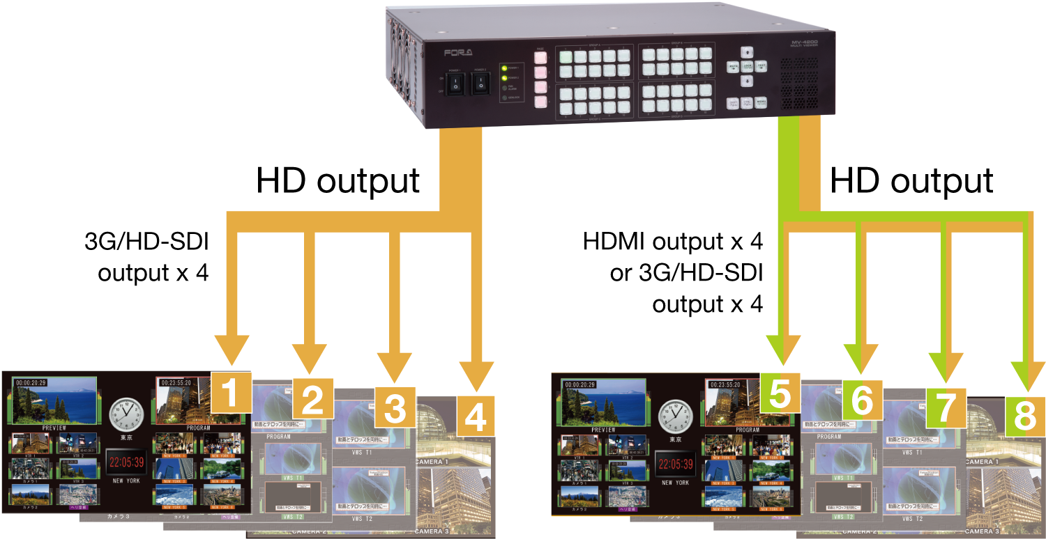 The MV-4000 series of multi viewers offers various models, including the MV-4220/4320, which support 12G-SDI inputs as standard, and the MV-4210/4310, which have SDI outputs instead of HDMI outputs and support up to 8 channels of SDI video output. Even models without 12G-SDI as standard can support 4K output with an optional MV-4220SDI card. In addition, the MV-4220SDI can support Quad Link 3G-SDI input in 2SI (2 Sample Interleave) format as well as SQD (Square Division) format.