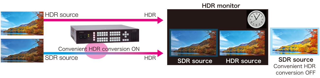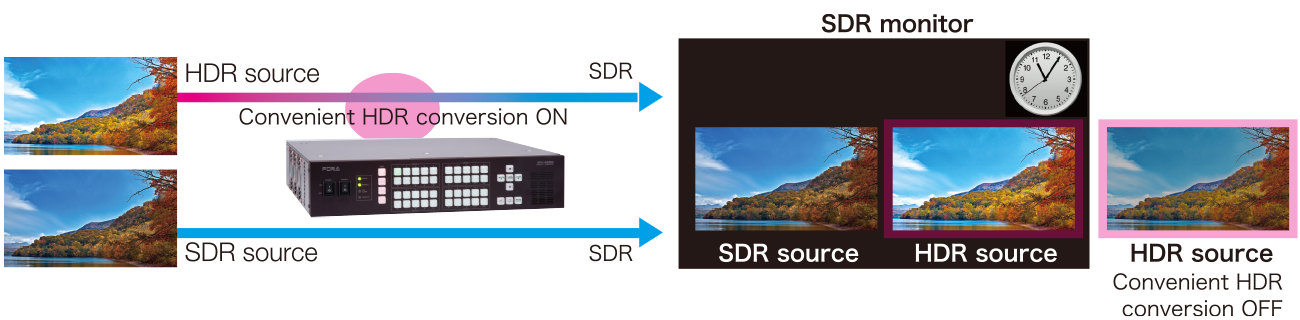 SDR-based graphics created in multi viewer such as titles, tallies, clocks, and level meters are converted for display on HDR monitors. This prevents overemphasized multi viewer graphics on HDR material.