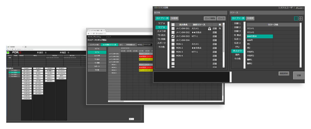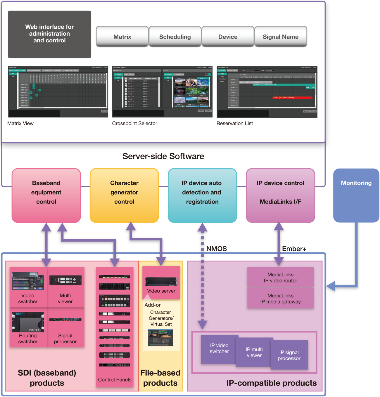 The system enables process control, focused on control of video signal routing. Users can make global adjustments and schedule control as needed. With the system, routing switchers are managed in virtual groups. It offers seamless operation, with no need to distinguish between baseband and IP, and enables flexible system building as you gradually bring SDI systems into the IP era.