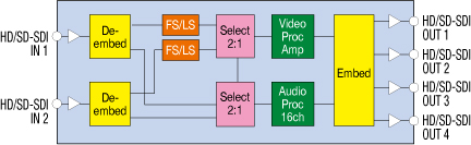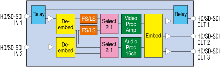 - HD/SD SDI 2-Input (manual or auto input switching)/1-synchronizer/3-Output