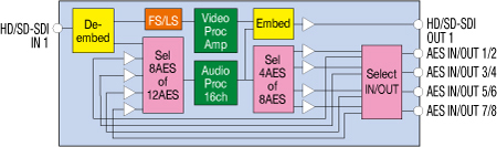 - If AES/EBU 4-Input selected: 16 re-embedded channels selectable from 24 channels including 8 AES/EBU and 16 SDI embedded audio channels.