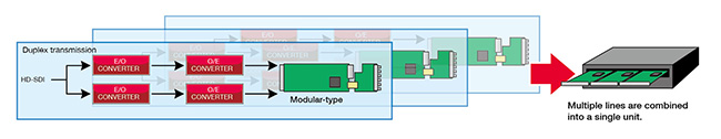 This is a modular-type SDI changeover switcher that can be mounted in a UFM frame. Seamless automatic switching of 3G/HD/SD-SDI signals increases duplex transmission reliability.
