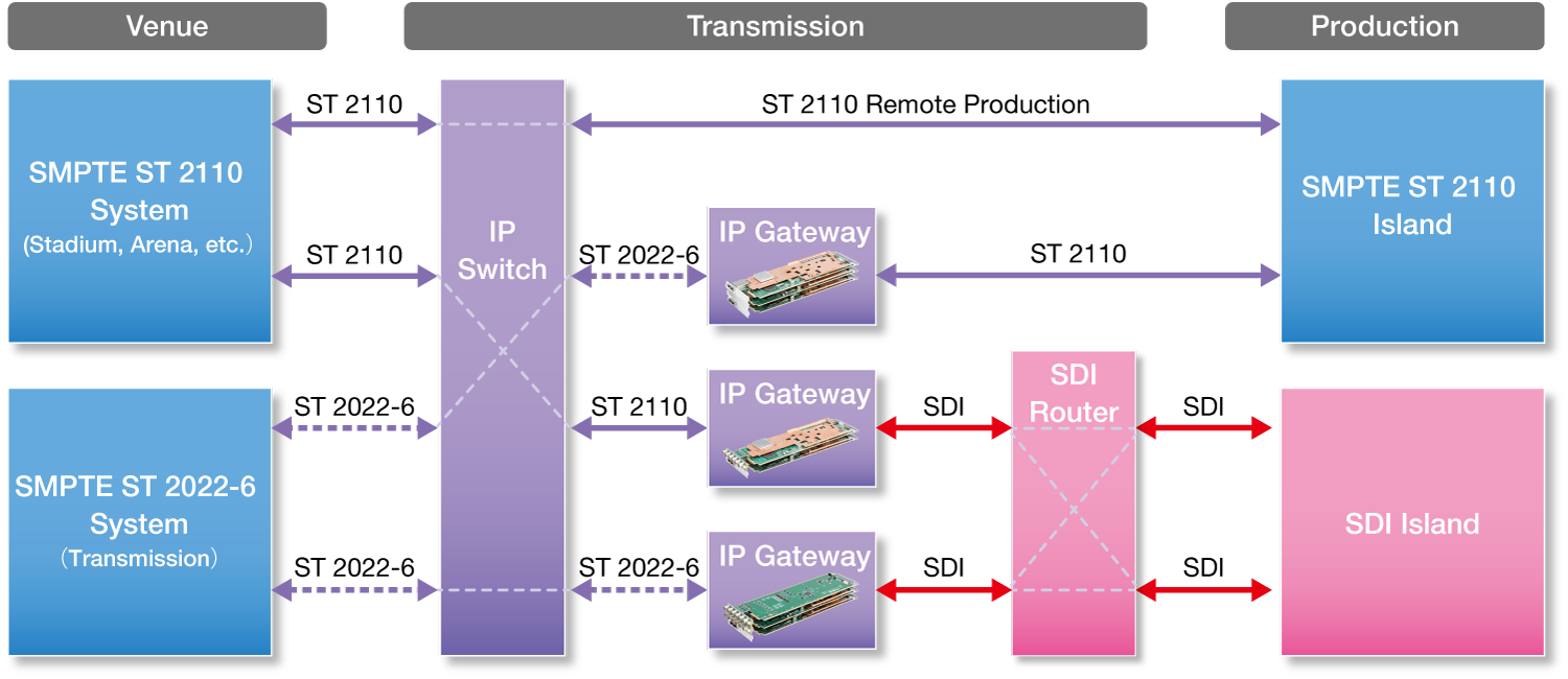 For an IP system, the SMPTE ST 2022-6 standard is mainly used in transmission. In a production system, SMPTE ST 2110 is the most commonly used standard. In the future, baseband and IP, as well as SMPTE ST 2022-6 and SMPTE ST 2110 may be mixed for production applications. The USF-10IP Series provides IP and baseband conversion, and supports system configurations with mixed standards.