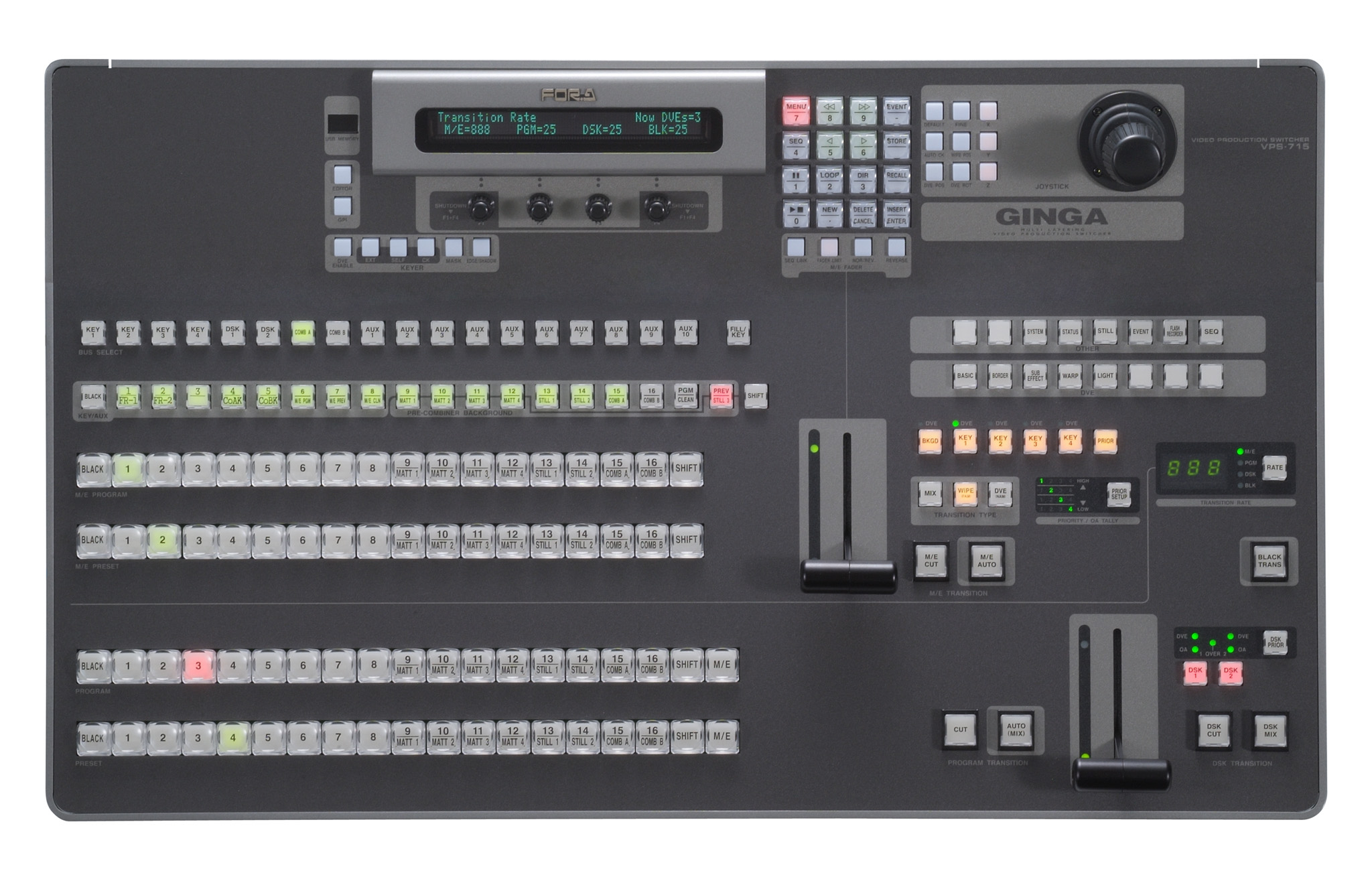 The VPS-715 incorporates an Mix/Effect (M/E) bus that enables cut, mix, wipe, and DVE transitions. A Program/Preview (P/P) bus is also included for allowing cut and mix transitions in later stages.