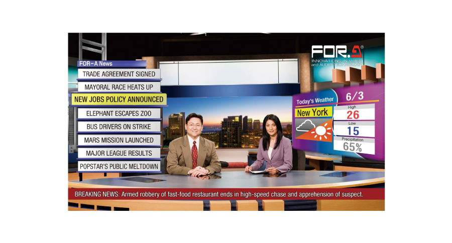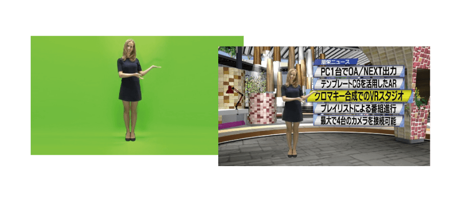 Full virtual production with chroma keying. – eLibrary: Provides about 160 CG background sets to choose from. (5 sets are included, with more than 5 requiring a separate purchase.) – Contact us for details on availability of original CG sets.