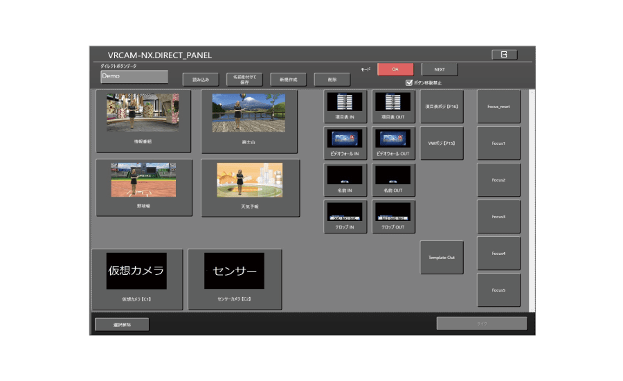 Spontaneous programs: Use direct buttons to manage playout – For flexible management, add only essential functions to the direct button panel. – “Grouping function” enables smooth execution of a series of operations. – Move or resize buttons as needed. – Instantly recognizable thumbnails created with screenshots or by pasting your preferred image, such as for the virtual camera in the lower left.