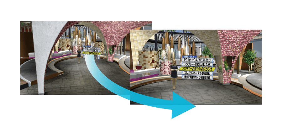 Sensor-equipped camera can be moved by an operator in real time for virtual production*1 – Dynamic video from graphics that follow camera movement. – Zoom in or out on billboard text or images on video walls. *1 Not available with virtual cameras.