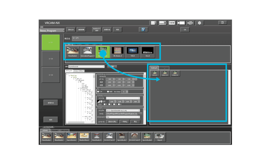 Create multiple scenes for a single program – Drag desired templates from the CG library to use them in scenes. – The configuration of the current template is shown in a tree format when finished adjusting the position, size, texture, and other attributes, drag to the area at right to save.