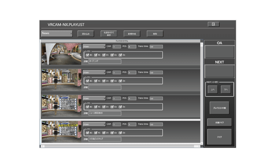 Programs with a specific flow: Use playlists to manage playout – Prepare playlists, then simply apply takes during programs to control the flow. – “Grouping function” assigns multiple events to a single button for smooth execution of serial operations. Example) 1. Move a virtual camera → 2. Wait one second → 3. Display graphics