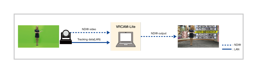 Playout with 3D CG is easy with the VRCAM software series. Simulated camerawork by virtual cameras has introduced more dynamic roles for fixed cameras. These systems also support content production and playout control using CG templates. Choose from the full-featured VRCAM-NX2, with NDI® and Unreal Engine support, or the economical VRCAM-Lite, an easy, NDI® compatible way to explore this technology.