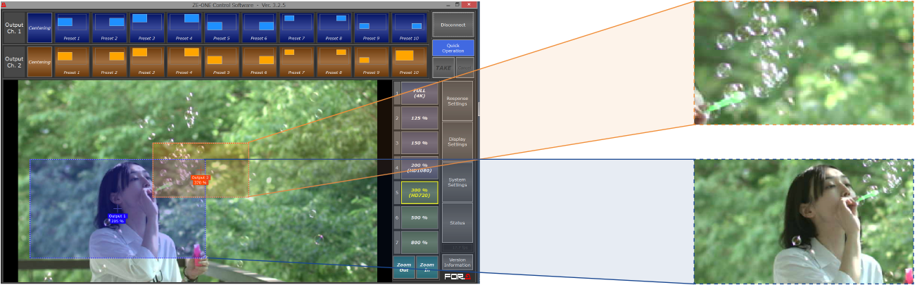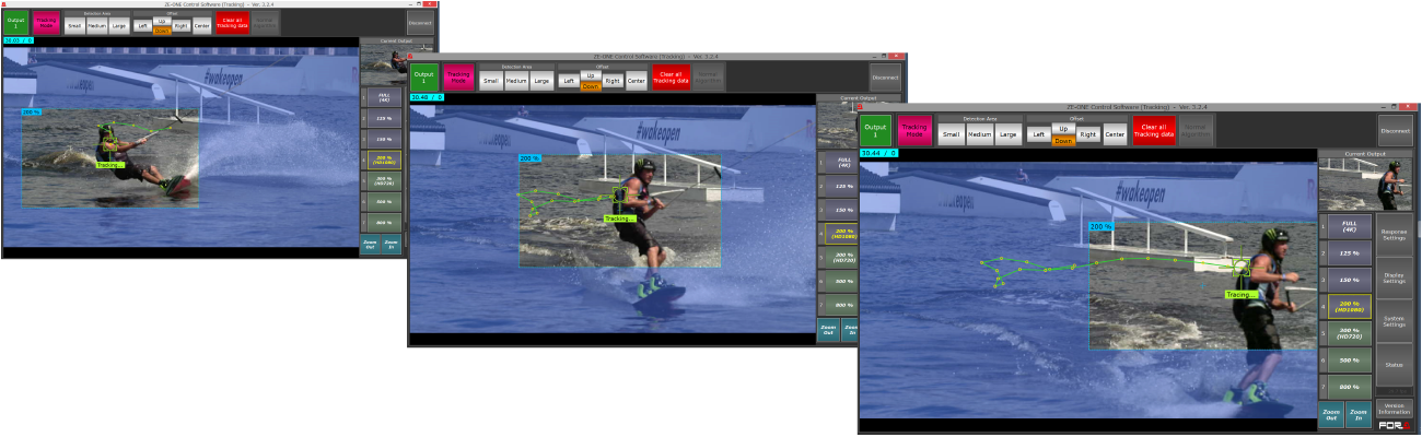 Frame and extract specified HD scenes of any size and/or position from 4K UHD sources (quad link 3G-SDI Level-A/B input) using an intuitive touch-screen interface.* The ZE-ONE tracks specified objects automatically in real time for extraction. Use of an FT-ONE high-speed 4K camera also allows simulated zoom, crop and camera motion with slow-motion instant replays. Enjoy unprecedented creative freedom in replays of live sports coverage and other applications.